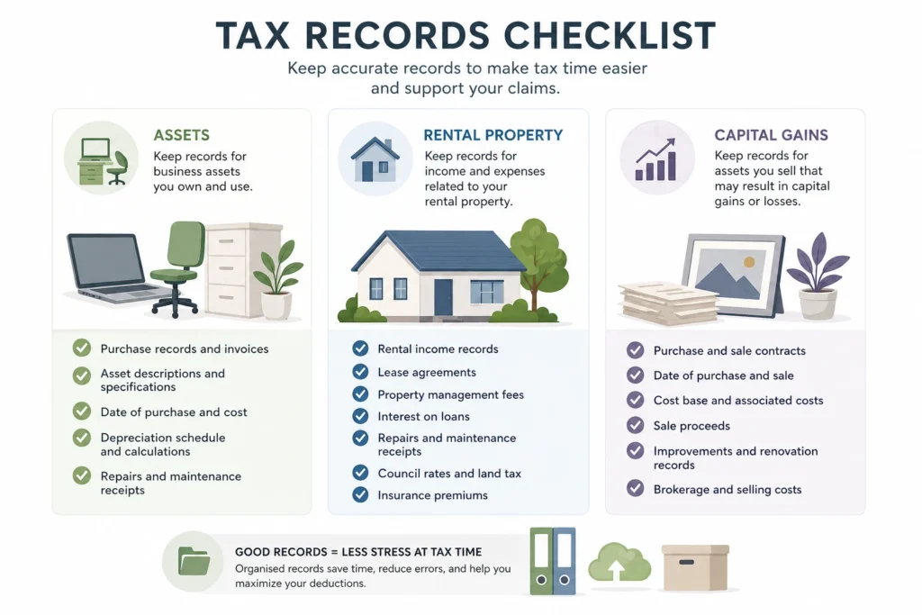 Some asset records need extra care because the retention period can stretch well beyond the usual cycle. For property and other CGT assets, records about buying, owning, improving, and selling can matter years later. Likewise, depreciating asset records can remain important well after the first claim.