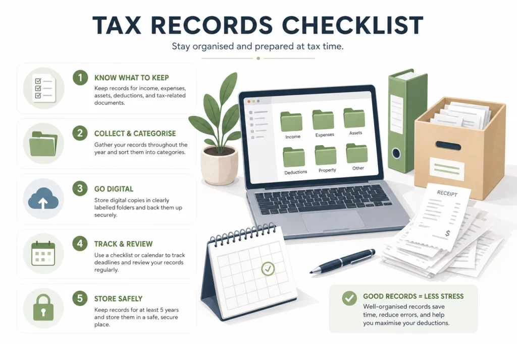 A tax records checklist can save time, reduce stress, and protect your tax return. It helps you keep the right evidence, support your claims, and avoid expensive mistakes. So, before tax time gets busy, it is smart to tighten your record keeping now.